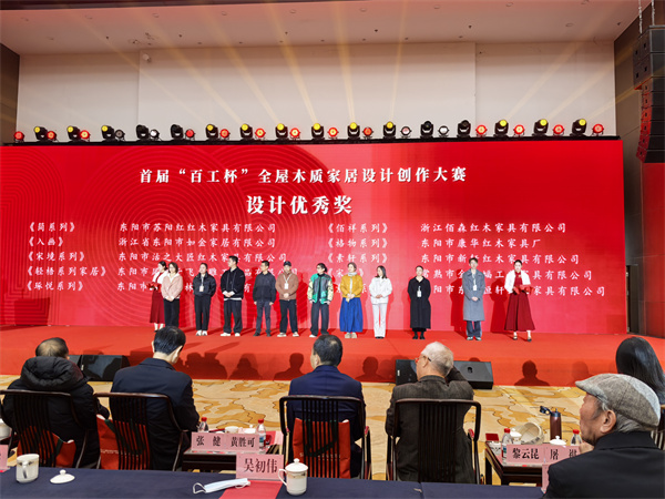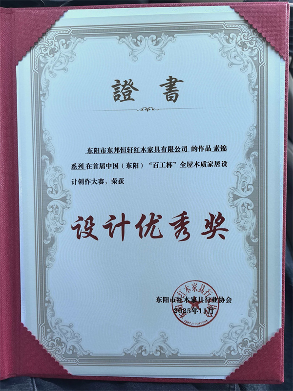 在备受关注的首届“百工杯”大赛中,东阳市东邦恒轩红木家具有限公司(以下简称“东邦红木”)选送的《素锦系列》《宋式雅韵》双双亮相,其中《素锦系列》凭借卓越的设计理念与精湛工艺,脱颖而出,荣获“设计类优秀奖”,充分彰显了东邦红木在红木家具创作领域的深厚积淀与创新实力。