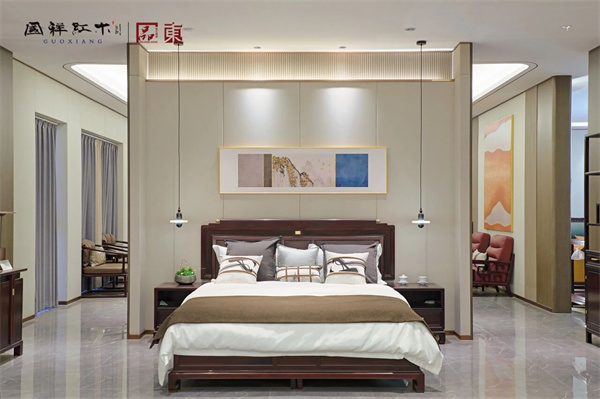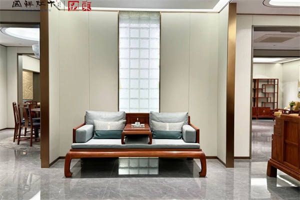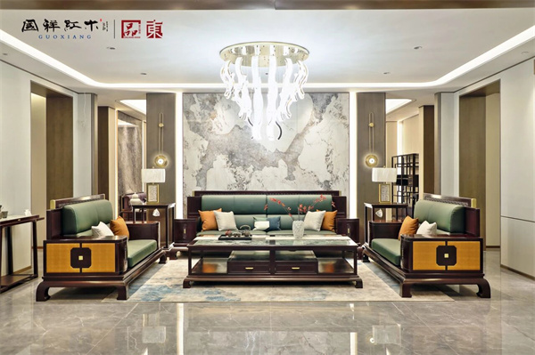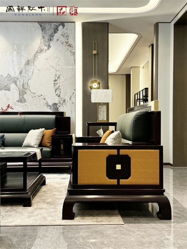 国祥红木“院隐风华系列” 便深谙此道,采用色泽温润的红酸枝材质为主体框架,搭配亮眼色系的软包,在沉稳中跃动出一抹精奢的亮色。这种搭配不仅打破了传统红木的厚重感,更以现代的设计语言,诠释了“老钱风”的低调与高贵,让古典与时尚在方寸之间完美交融。