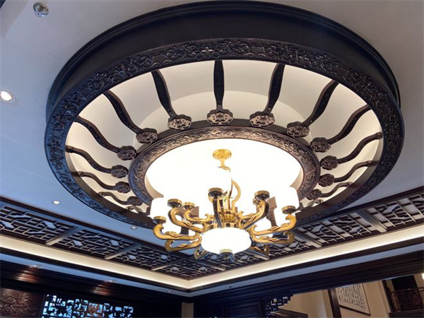 顶面:镂空格栅拼接出层次,中央圆形吊顶的边缘,是东阳木雕式的传统纹样镂空,内嵌灯光亮起时,雕花的阴影把中式韵味揉进了光影里。
