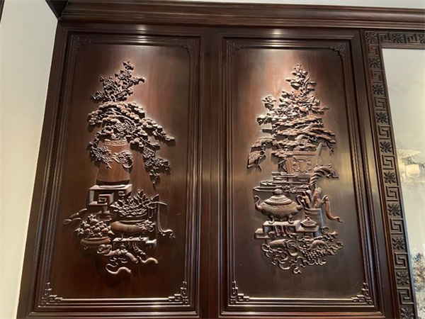 墙面:实木护墙板并非单调平面,而是带着山水纹样的浮雕工艺 —— 每一道纹路都是非遗匠人的手工温度,搭配同材质的壁画边框,让墙面成了“可触摸的中式画卷”。