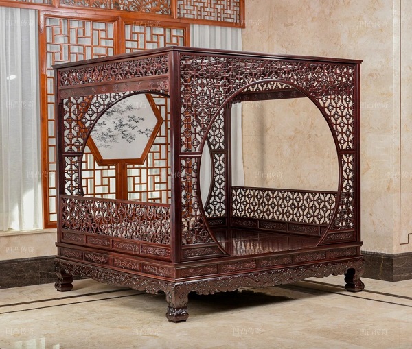 该床设计为双月洞式,床面四角栽立柱,与顶部“井字格”承尘构成床架。床体四周的矮围子及挂檐,均用四簇云纹加十字构件连接而成,图案十分繁缛。四簇云纹又称为“四合如意”,用在架子床上,蕴含吉祥之意。