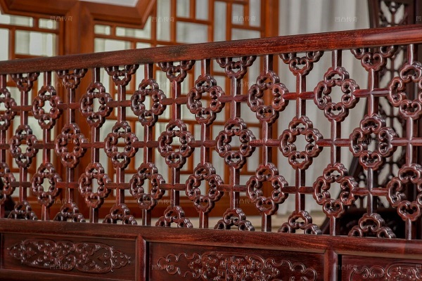 此架子床上的梅花格均以细小木块攒斗而成,工艺十分繁琐。一个小小的梅花花格,需用料4块,以插肩榫咬合连方,四边再凿卯以纳“十字枨”,上面共有四榫八卯,36个锯口。