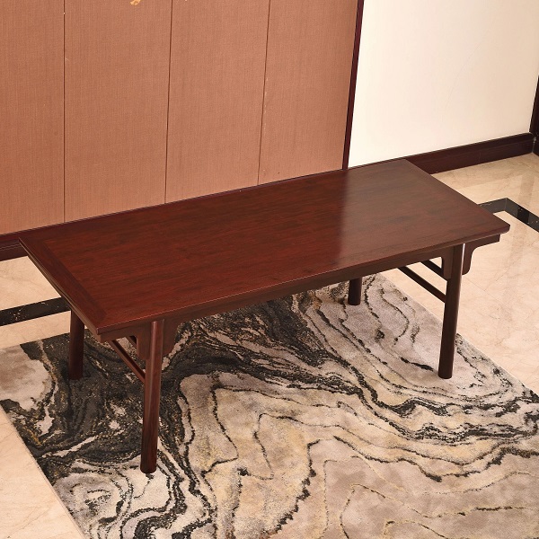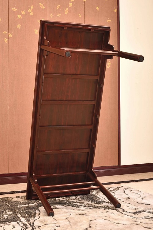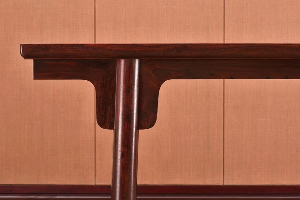 圆包圆造型是该桌的一大亮点和难点,需将棱角倒圆,做成圆弧面,两根枨子在转角处相交,四面交圈。从侧面看,圆形的腿足被圆弧形外轮廓的边抹、垛边、裹腿枨一层层的包裹,在视觉上增加了厚度及层次感。