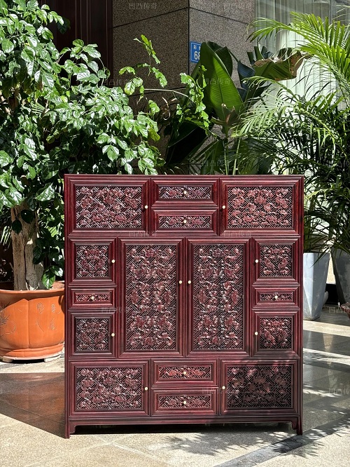 打开柜门的一瞬间,小叶紫檀木材的香气扑鼻而来,这就是顶级材质的天然印记,整件柜子往家里一放,就有一种顶天立地的气场,震撼力十足。它远远不是一件家具,更是一件可以代代相传、承载家族记忆的永恒资产。