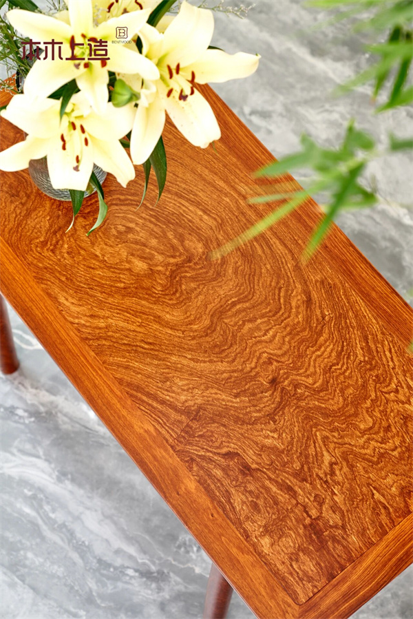 我们聚焦三大经典木料,各具特色:24K刺猬紫檀作为性价比与稳定性兼具的优选,常年备有充足库存,确保每一件定制家具都能用上正宗原材,杜绝掺假;缅甸花梨作为国标红木中的热门品类,不仅密度适中、耐磨抗压,更自带天然檀香,能安神舒缓,其独特的虎皮纹、水波纹纹理,经整板裁切后更显质感,是颜值与实用性的双重担当;有着"万木之王"称号的柚木,凭借极小的膨胀收缩率,实现日晒雨淋不翘不裂,天然油脂带来的耐腐防虫属性,让家具即便历经岁月也能保持完好状态,泰坦尼克号甲板的用料便是其稳定性的最佳证明。