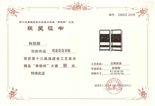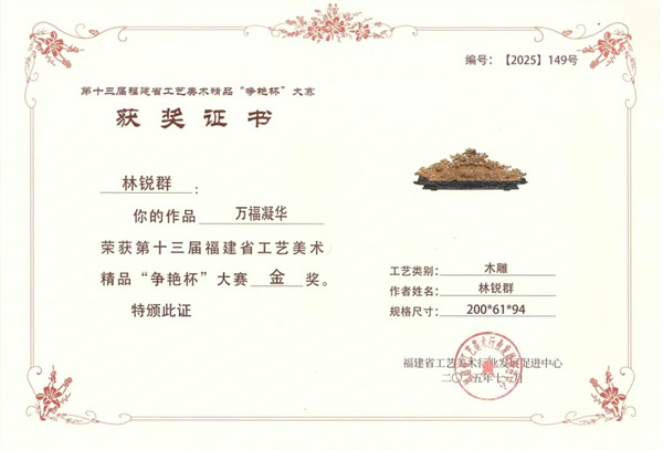 在刚刚落幕的第十三届福建省工艺美术精品“争艳杯”大赛中,两木创始人、省工艺美术大师、省级非遗传承人林锐群先生,以两件匠心之作再度折桂!其中,老山檀木雕作品《万福凝华》 荣膺木雕类金奖,家具作品《戗金花鸟书柜》 荣获古典家具类铜奖,彰显了传统工艺在当代的非凡活力。