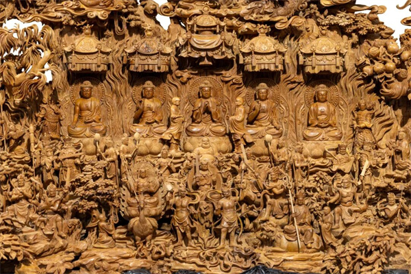 作品的布局堪称“密不透风,疏可走马”,在有限的体积内营造出无限的宇宙空间感。五尊主佛并非孤立存在,而是互为呼应,宝相庄严,气度恢弘。周侧的诸天圣众、护法罗汉,姿态各异,如云环绕。其间,流云增添了空间的灵动,宝树象征着智慧的生长,寿桃寄托着长寿之愿,石榴寓意着多子多福。这些元素并非简单堆砌,而是和谐共生,共同编织出一幅“万福凝华”的圆满境界,将信仰的庄严与生活的美好愿望紧密相连。