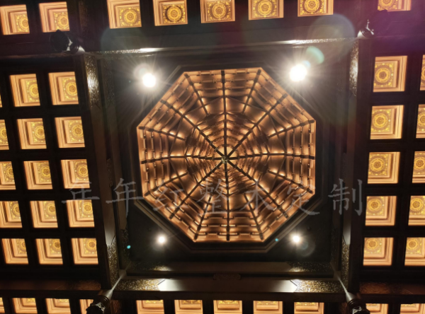 藻井华章,光影叙事:吊顶严格按皇家宫殿中式藻井制式设计,结构繁复精巧,不仅承载着中国古建筑中“天人合一”的哲学观念,更成为空间的精神穹顶。这一木作杰作,配合荣获2023年亚洲照明设计奖的照明系统,使得光线在藻井的层层格栅与雕花间流转倾泻,营造出庄严、神秘而又温暖的光影氛围,让现代照明科技与传统木结构之美相得益彰。