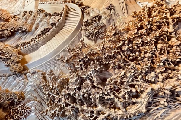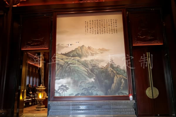 雕梁画栋,壁藏山河:内部装修极为讲究,定制了大型木雕壁挂与立体木雕画。墙面巨幅漆器画与木雕作品相映成趣,讲述着闽越之地的历史传说与风土人情。珍稀红木材质与精湛雕刻工艺,每一刀一刻,皆是对传统的坚守。力求纹理连贯、画面完整,展现木材天然之美与人工雕琢之精的完美融合。