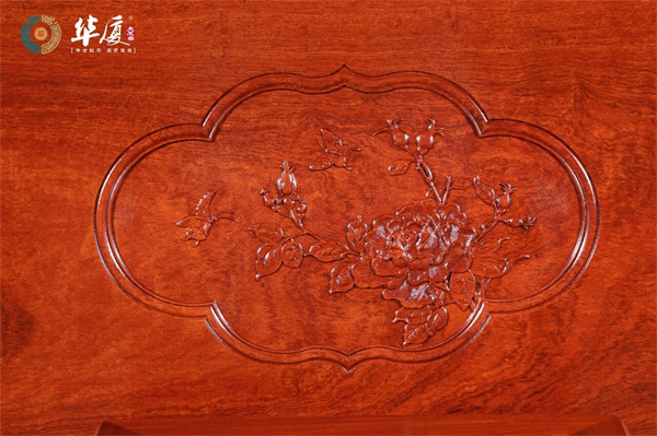 靠背板上匠人依循木材纹理顺势雕刻,将牡丹盛放的华贵化作背板上的暗香浮动,含蓄而典雅。