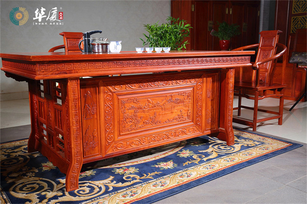 缅甸花梨《好运来茶台》其名寓意吉祥,茶台挡板上精雕细琢的山水亭台,搭配四周的回形纹装饰,寄托着“岁月静好、盛世安康”的美好愿景。