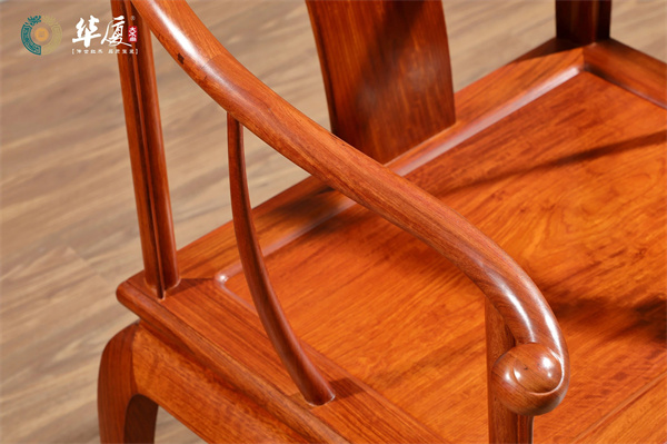 扶手蜿蜒向下,末端向外翻出成小球,点缀简单螺旋纹;S型素面靠背贴合人体曲线,提供舒适倚靠;下架四根管脚枨再接龟足,确保四平八稳。