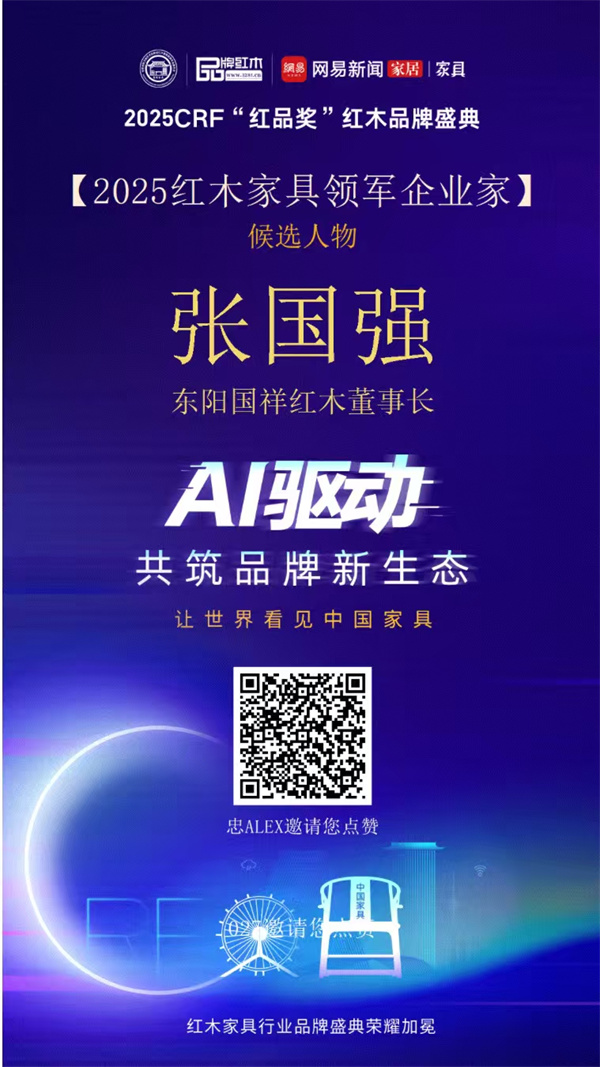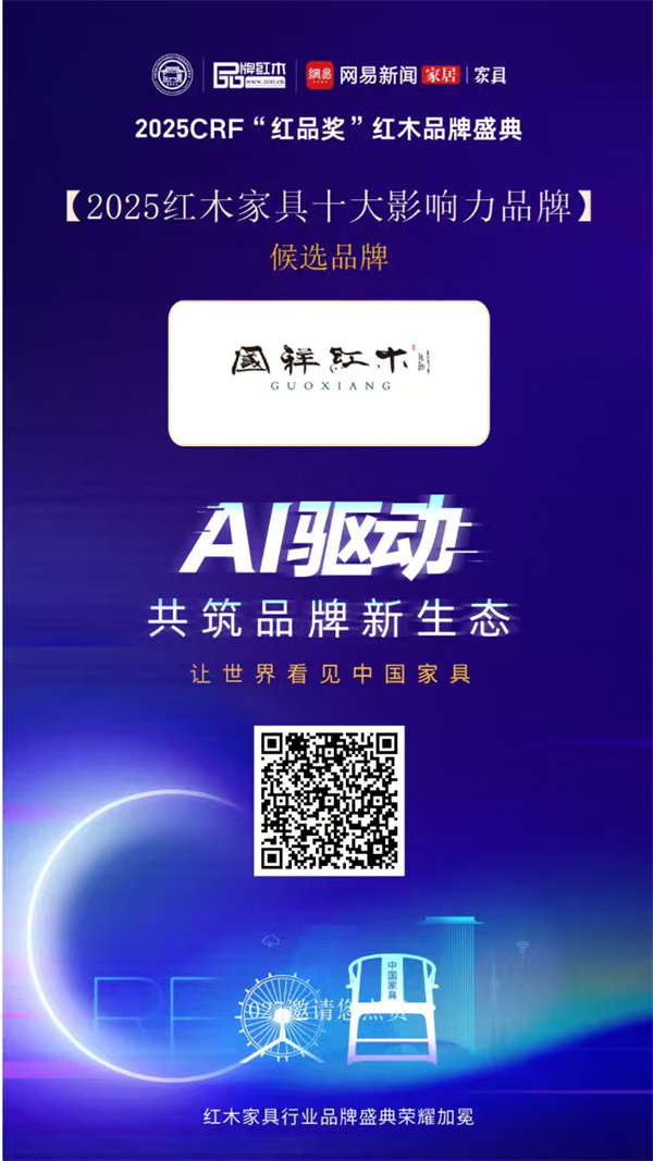 在此次评选中,国祥红木董事长张国强入围【2025红木家具领军企业家】候选人,国祥红木提名【2025红木家具十大影响力品牌】【2025大果紫檀家具热门品牌】。2025年12月6日至11日,点赞通道正式开启,期待您点赞支持,转发助力,共同见证国祥红木的品牌实力!