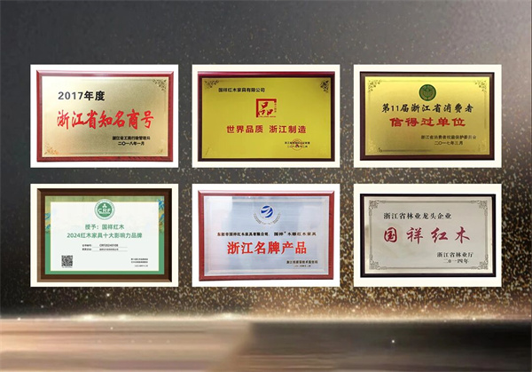 在张国强的带领下,近年来,国祥红木先后斩获了红木家具十大影响力品牌、浙江省知名商号、浙江省名牌产品 、浙江省林业重点龙头企业、浙江省消费者信得过单位 、浙江省家具行业先进企业等百项荣耀,彰显其卓尔不凡的领导力。