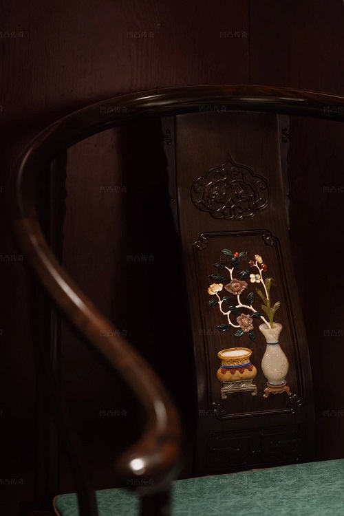 侧板镶嵌清供博古图,每一处细节都暗含“清供雅玩”的文化密码,让坐具成为可触摸的立体画卷,既有雅致生活的寓意,也透露着文化的传承。