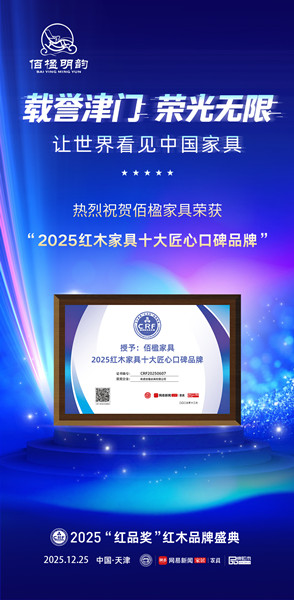12月25日,备受瞩目的第16届红木家具品牌峰会在上合峰会举办地——天津隆重举行。同期举办的2025“红品奖”红木品牌盛典上,南通佰楹家具有限公司(以下简称佰楹家具)凭借凭借在紫光檀精品领域的深耕细作、对匠心工艺的极致追求及高端定制服务的卓越表现,从众多品牌中脱颖而出,斩获“2025红木家具十大匠心口碑品牌”殊荣。