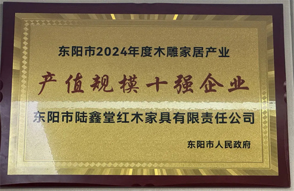 在由东阳市人民政府主办的 2024 年度木雕家居产业“十强企业”颁奖典礼上,喜迎红红木凭借深厚的技术底蕴、卓越的产品品质以及强大的市场竞争力,在众多参评企业中脱颖而出,斩获“产值规模十强企业”殊荣。