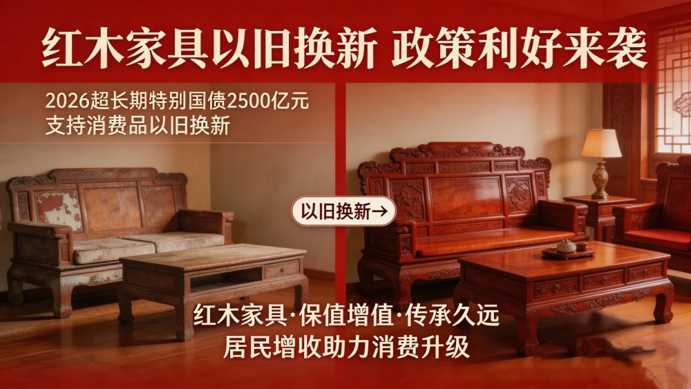 报告明确提出,2026年将“安排超长期特别国债2500亿元支持消费品以旧换新”。这一政策延续并加力扩围了此前的促消费举措,对红木家具行业而言是重大利好。