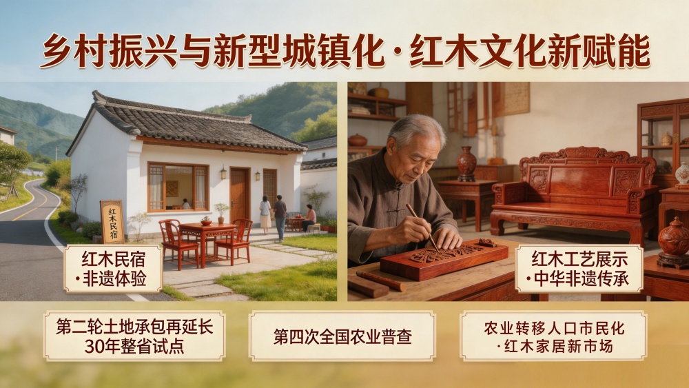 红木文化作为中华优秀传统文化的重要组成部分,可与乡村旅游、文化体验等项目结合,打造红木工艺展示、非遗体验、红木民宿等新业态。同时,农业转移人口市民化过程中,新市民群体对品质生活的追求,也将为红木家具在中低端市场开辟新的增长空间。