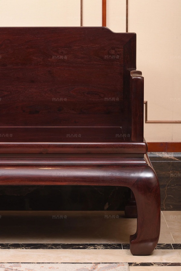 沙发的造型严格遵守明式家具的比例法则,围板攒框镶板,边抹冰盘沿,腿足采用马蹄足鼓腿彭牙形制。所有线条的蜿蜒流转,都如行云流水般舒畅自然。这种“多一分则肥,少一分则瘦”的精准把控,正是明式家具的灵魂所在。
