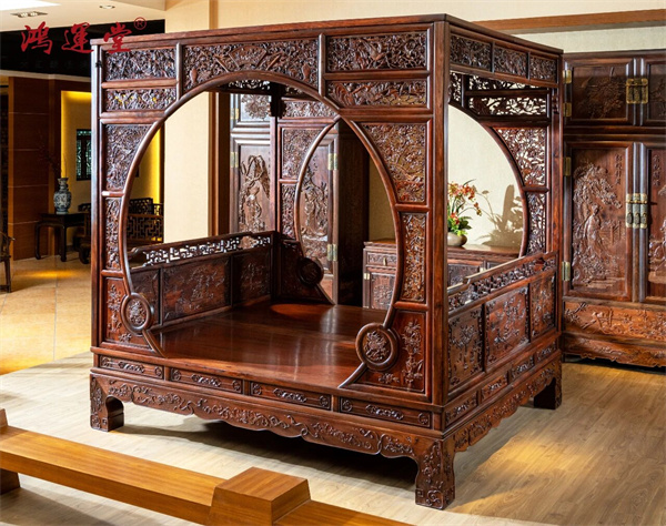 《酸枝花鸟架子床》取自宋代院画的花鸟构图精髓,灵雀栖枝、暗香浮动的画面被转化为床围上的立体雕饰,在虚实相间中展现生机盎然的自然意境。