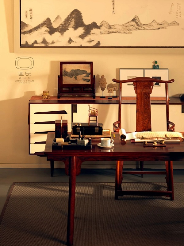 “随艺而安”的理念,源于区锦泽多年来的观察与实践。早在区氏家具于北京举办的“汲古涵今——当代书房艺术”展览中,他便开始尝试以场景化的方式来呈现家具。这种尝试打破了传统家具孤立展示的静态模式,将家具置于书房、茶室等具体的生活场景中,讲述完整的故事。