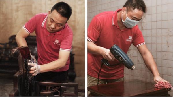 雕刻之后,全靠手工打磨赋予家具温润质感。工匠从粗到细历经数十道工序,顺木纹细细打磨,棱角转角一丝不苟,椅面、扶手、桌面都顺滑细腻。