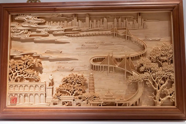 在创新设计上,鸿庭轩坚持“创新必先知古”,把非遗木雕技艺与本土文化元素相互结合,创作了“深中通道”主题木雕等相关作品,让传统木作工艺得以延续展现。
