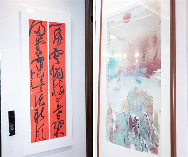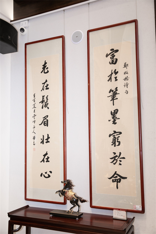 展厅内,一件件造型典雅、工艺精湛的红木家具与书画作品相映成趣:遒劲的书法条幅悬挂于雕花博古架前,写意山水与红木案几上的青瓷古器遥相呼应,虚实相生间,构建出一幅传统与现代交织的文化长卷。