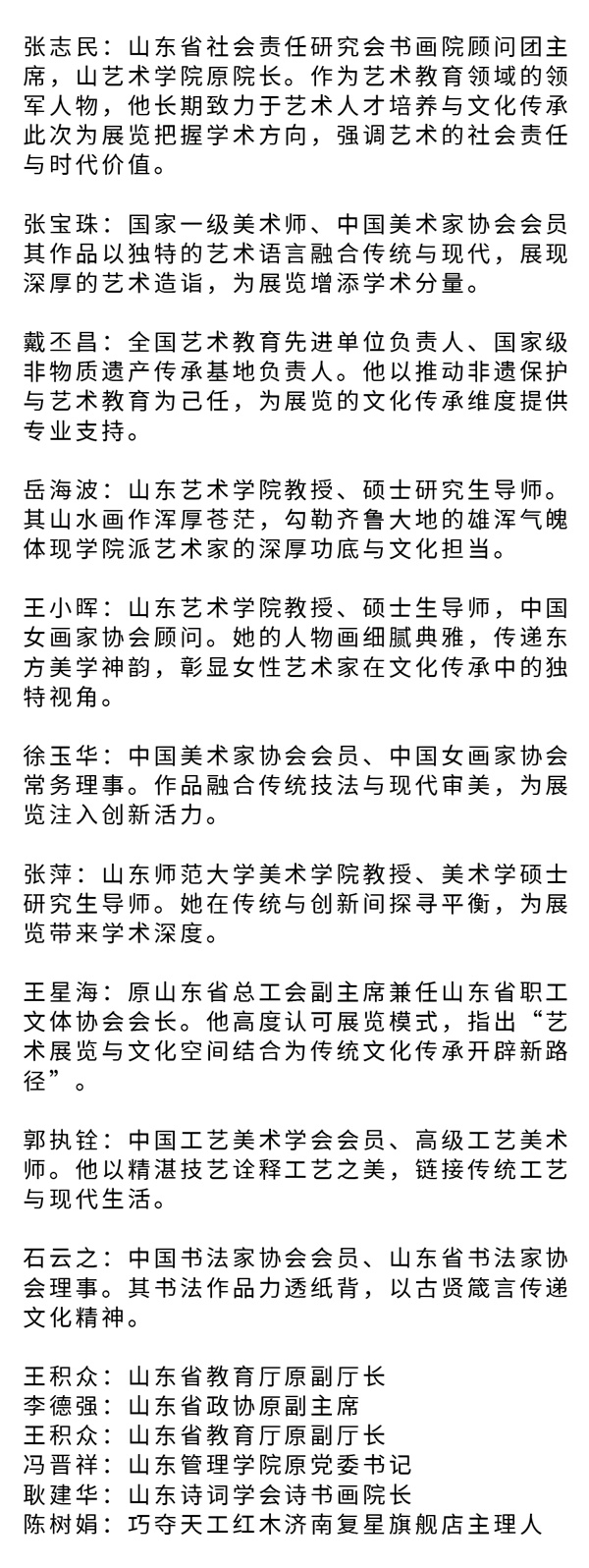 本次展览由山东省社会责任研究会书画院主办,巧夺天工红木复星旗舰店、雯昌艺博美术馆联合承办,汇聚山东省内数位一线书画名家的精品力作,并邀请多位艺术领域专家领导莅临现场,共同见证一场艺术与匠心交融、传承与创新辉映的文化盛事。