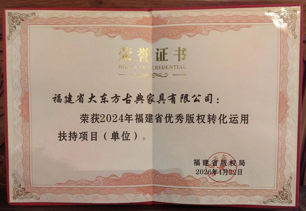 福建省大东方古典家具有限公司(以下简称“东方古典”)凭借在红木家具版权转化运用领域的突出成效,成功入选“2026年度福建省优秀版权转化运用扶持项目”,成为仙作红木家具行业获此殊荣的企业。