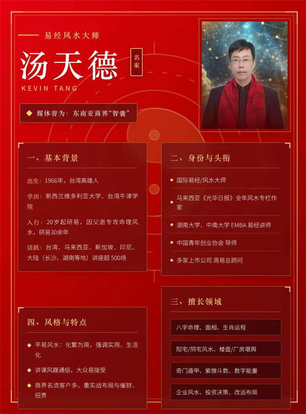 本次活动的另一位重磅嘉宾——汤天德大师,将为您揭晓答案。作为国际易经风水大师、马来西亚《光华日报》全年风水专栏作家、湖南大学及中南大学EMBA易经讲师、多家上市公司周易总顾问,汤天德大师研易三十余年,活跃于台湾、马来西亚、新加坡、印尼及中国大陆,讲座逾500场,被誉为东南亚商界“智囊”。