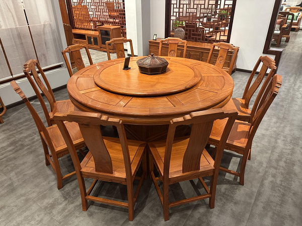 餐厅里,缅花圆台餐桌适配日常用餐与亲友小聚,桌面纹理流畅,边角打磨圆润,搭配同系列餐椅,结构扎实,既贴合中式用餐的雅致氛围,又兼顾日常使用的便捷实用。