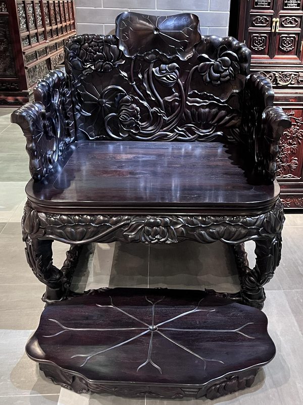 代表作小叶紫檀莲花宝座,精选厚重紫檀料,遵循明式制式,鼓腿膨牙、内翻马蹄足,满雕工艺细腻生动,兼具实用性与艺术观赏性。
