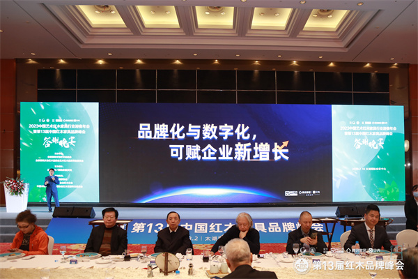 晚宴上,主承办单位代表——全联艺术红木家具专业委员会执行会长,品牌红木创始人、CEO林伟华做了答谢致辞和主题分享,在分享中他从政策面、用户面、企业面分析了2023中国红木家具产业局势,并分析了品牌化及数字化对红木企业高质量发展的重要性,以及展望了品牌红木2023奋进之路。