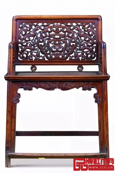 同时,在靠背、扶手以及牙板上做了大面积的透雕、浮雕纹饰。