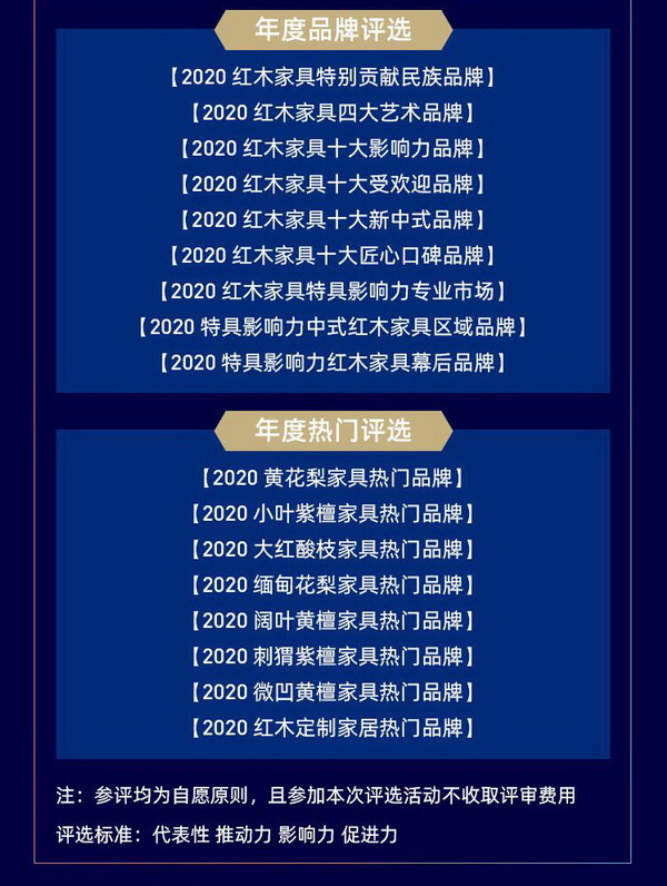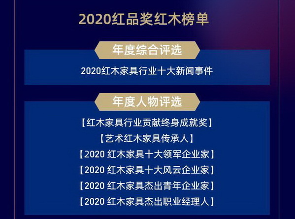 2020红木家具“红品奖”由综合类、人物类、品牌类、热门类4张榜单组成。品牌类的红木家具十大影响力品牌、十大受欢迎品牌、十大新中式品牌、十大匠心口碑品牌,具有行业风向标意义,一向备受关注。